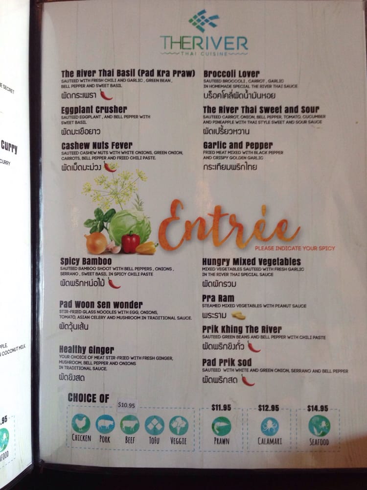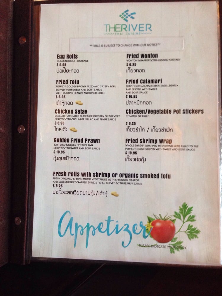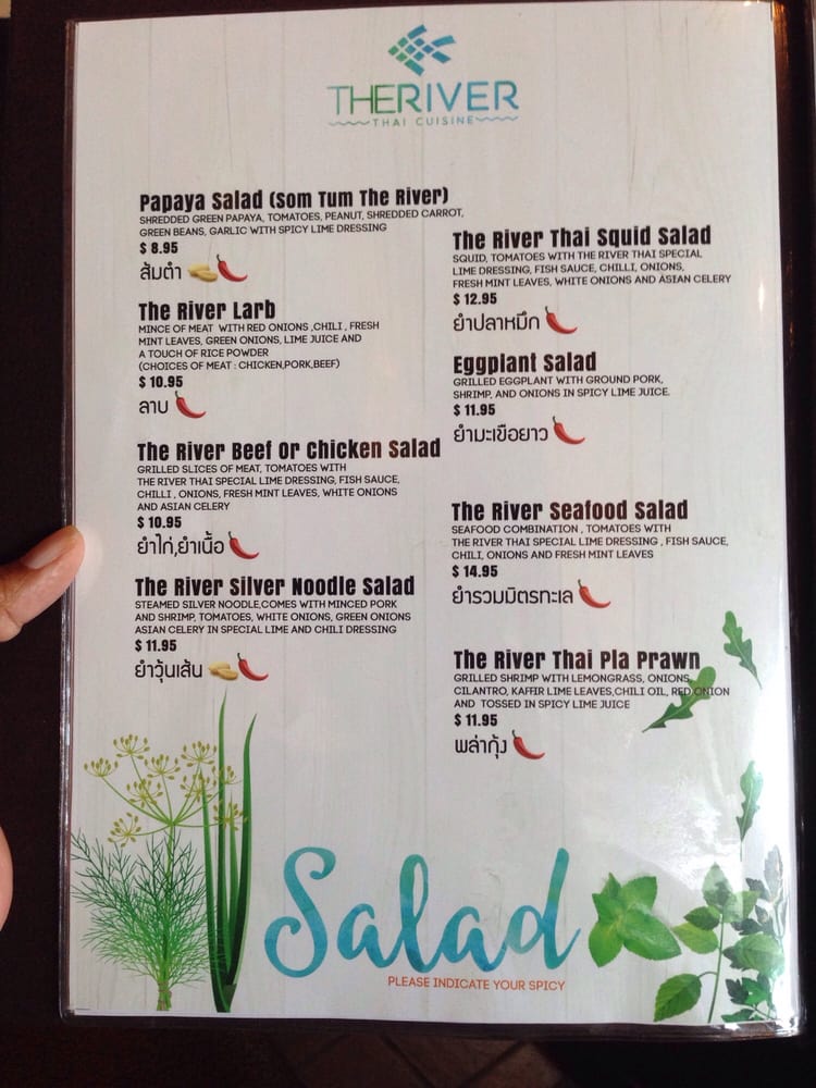 Som tum the river. Shredded green papaya, tomatoes, peanut, shredded carrot, green beans, garlic with spicy lime dressing. Spicy.