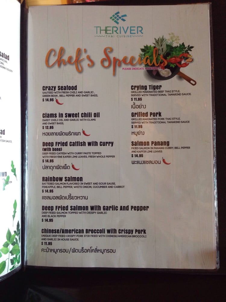 Squid, tomatoes with the river Thai special lime dressing, fish sauce, chili, onions, fresh mint leaves, white onions, and Asian celery. Spicy.